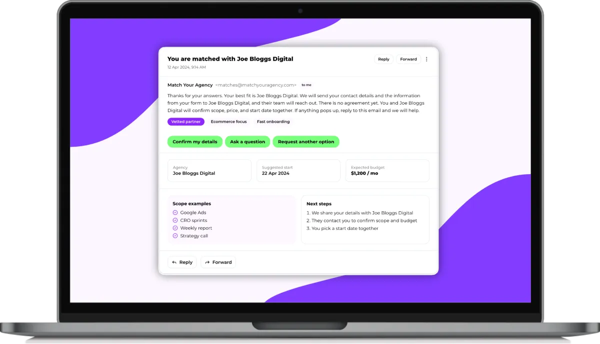 We score active partner agencies against the brief and capacity. We verify recent wins and delivery leadership. The brand receives one clear recommendation with a profile and an intro email to the partner agency. The partner agency books the call and runs the meeting.